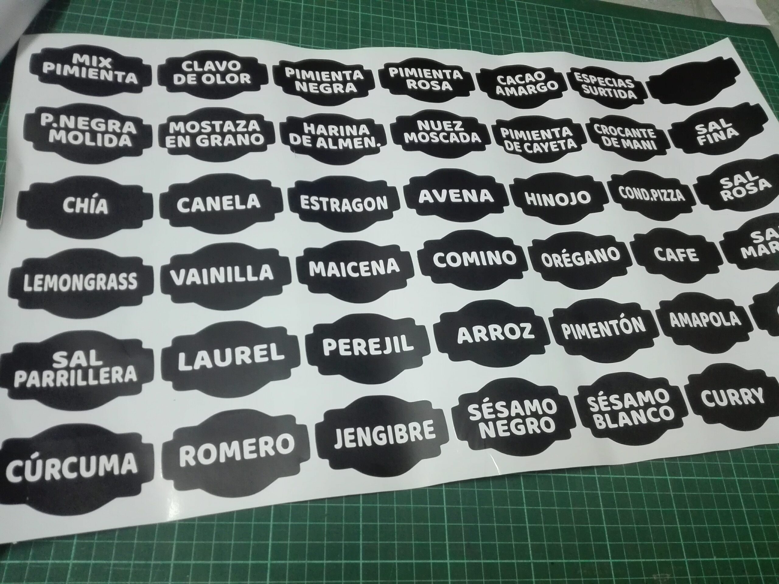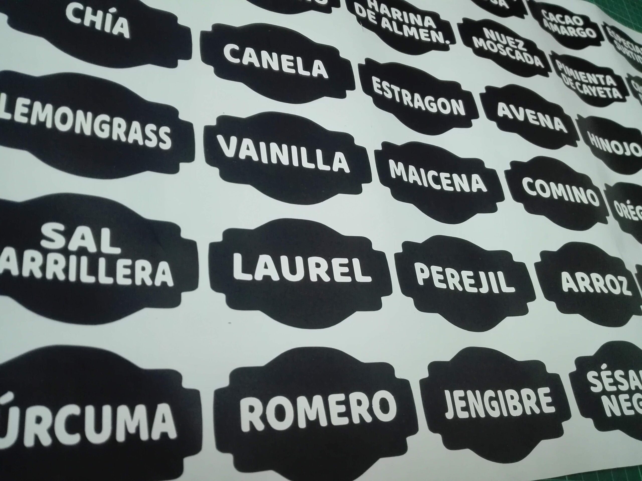 30 Etiquetas para Frascos Condimentos en vinilos de color negro mate, letras blancas rotuladas en vinilo autoadhesivo.