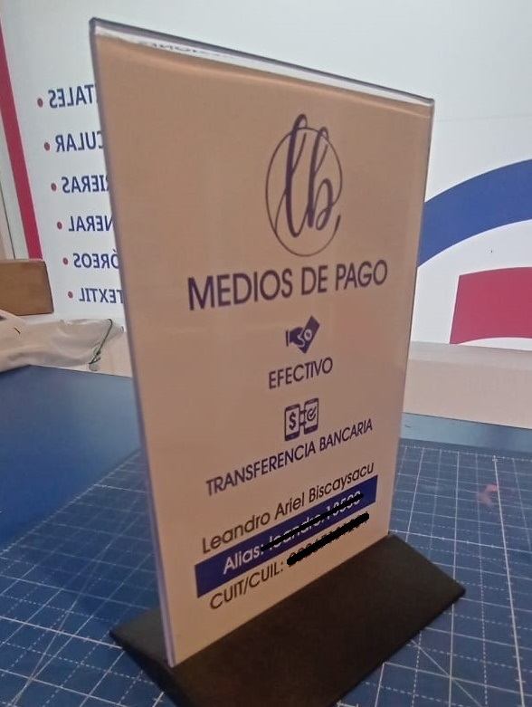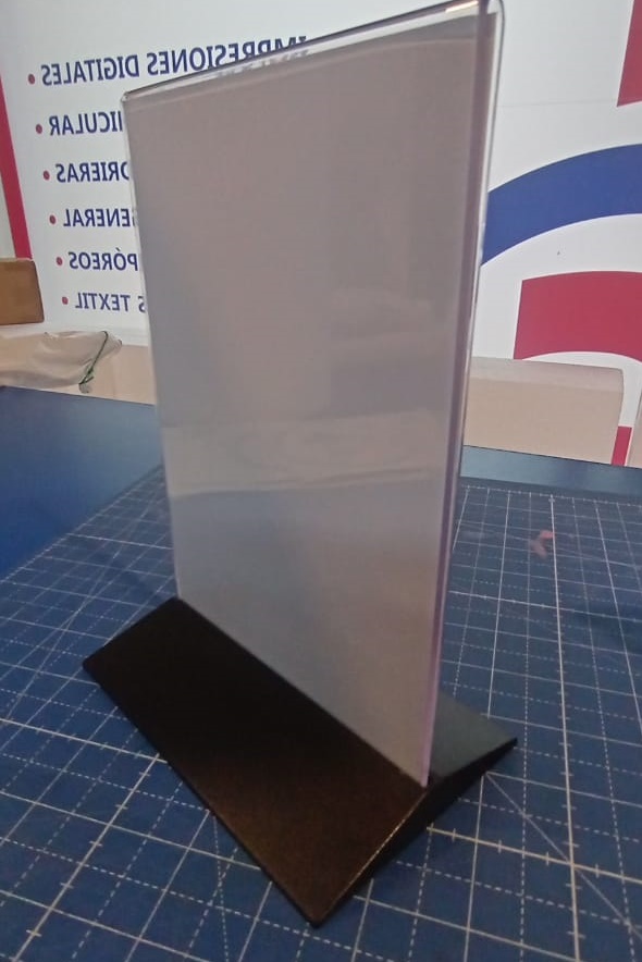 Exhibidor de Acrílico doble faz impresos en vinilo simple o doble cara, con pie desmontable. Ideales para exhibir menú o código QR.